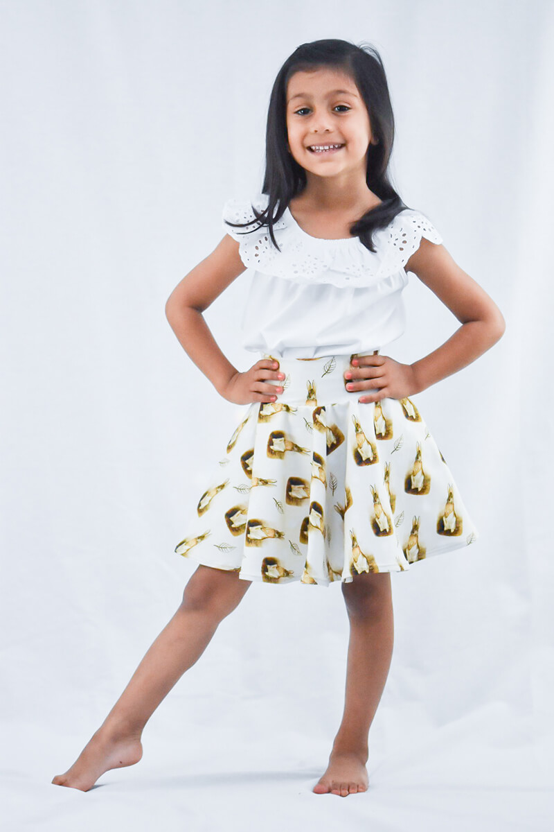 The Bunnies Swish Skirt is a knee length circle skirt with a comfortable waistband perfect for your little ones to twirl around in. This skirt is made of 95% cotton and 5% lycra and is available from 3 months – 8 years.